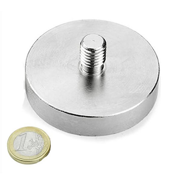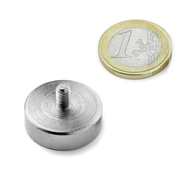 The Ø16 small external threaded pot magnets are made of rare earth neodymium, standard thickness is 5mm. There are M4 threaded pins on the steel shell, which make it mountable. You can get about 12 lb pull force by using external threaded neodymium pot magnets Ø16x5mm. In the pot magnets wholesale, cheap price and short lead time are available for Ø16mm neodymium external thread pot magnets.